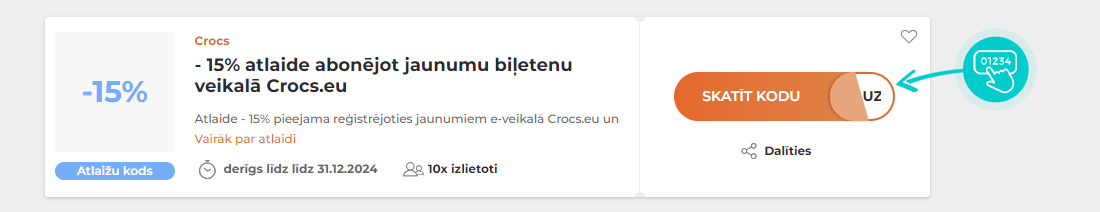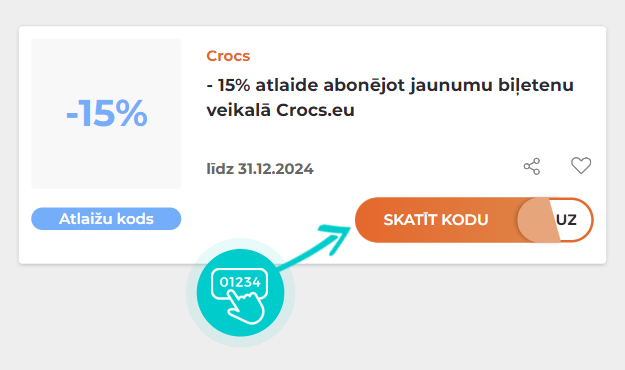 Atrodi sev vēlamo Crocs atlaides kodu mūsu vietnē un noklikšķini uz pogas "Skatīt kodu".
