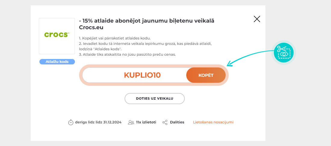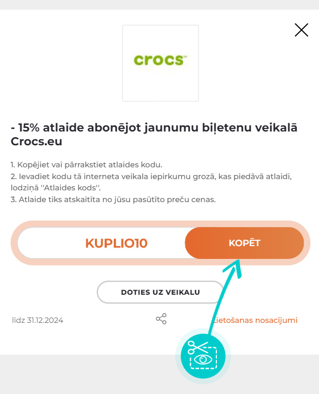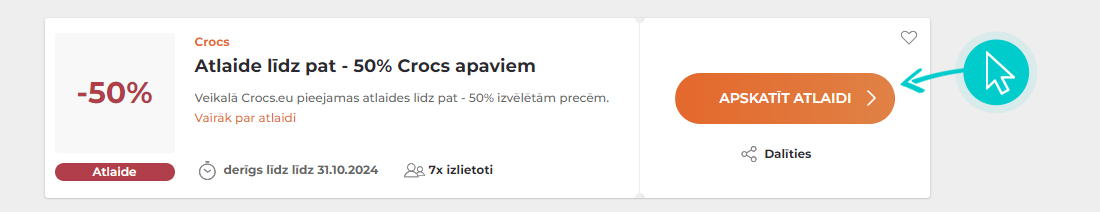 Apmeklē Kuplio.lv un izvēlies sev vēlamo Crocs atlaidi mūsu vietnē un klikšķini uz pogas “Apskatīt atlaidi”. Uzreiz pēc tam tu tiksi automātiski novirzīts uz oficiālo Crocs interneta veikalu, kur varēsi iegādāties preces par izdevīgāku cenu.