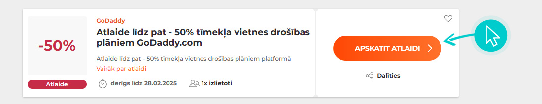 Apmeklē Kuplio.lv un izvēlies sev vēlamo GoDaddy atlaidi mūsu vietnē un klikšķini uz pogas “Apskatīt atlaidi”. Uzreiz pēc tam tu tiksi automātiski novirzīts uz oficiālo GoDaddy interneta veikalu, kur varēsi iegādāties preces par izdevīgāku cenu.