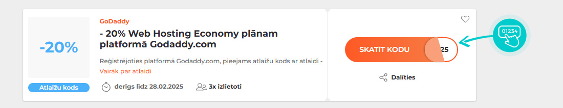 Reģistrējoties platformā Godaddy.com, pieejams atlaižu kods ar atlaidi - 20% jaunajiem klientiem.