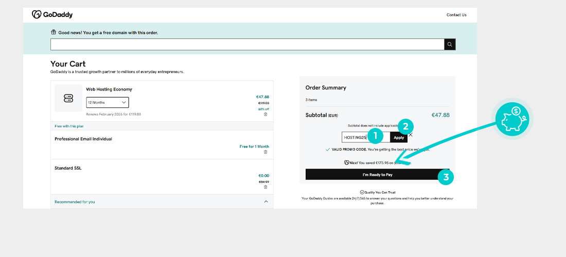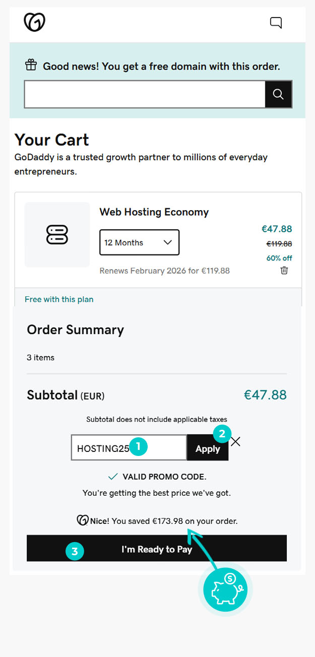 Nezini, kā izmantot GoDaddy atlaižu kuponus? Piedāvājam vienkāršu ceļvedi, kā to ātri un veiksmīgi piemērot pirkuma laikā: