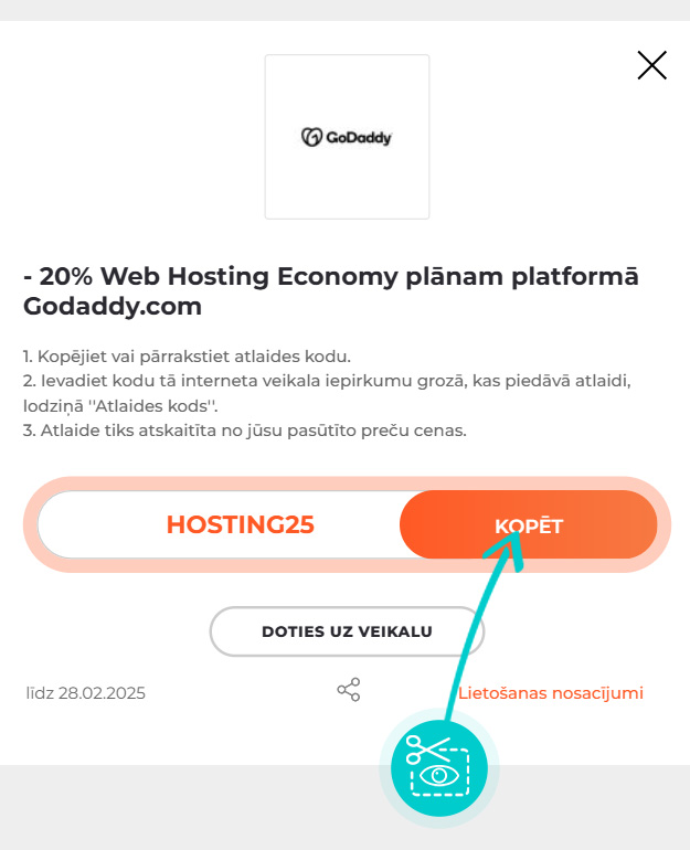 Nokopē vai pārraksti atlaides kodu un nospied pogu “Doties uz veikalu”. Tu tiksi automātiski novirzīts uz GoDaddy oficiālo interneta veikalu.