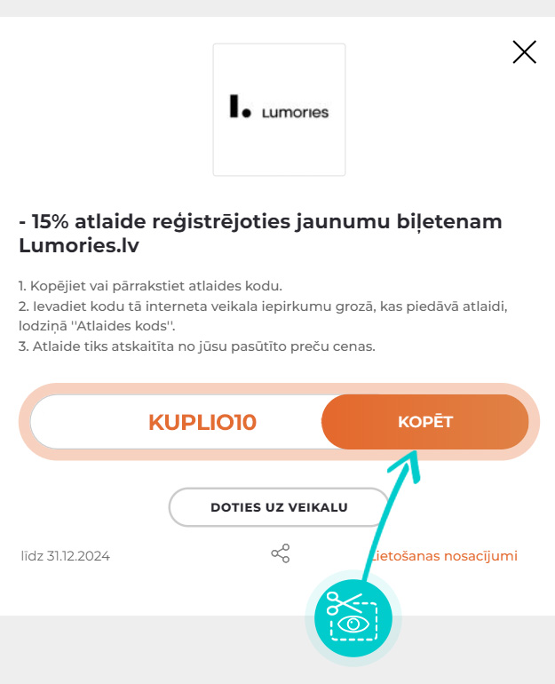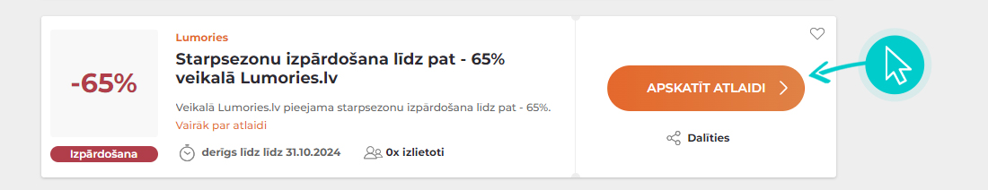 Atlaide - 15% pieejama pierakstoties jaunumu saņemšanai e-veikalā Lumories.lv, ievadot atlaides kodu, ko saņemsiet pēc reģistrācijas apstiprināšanas. E-veikals nosūtīs jums atlaides kodu pirmajam pirkumam tiešsaistē uz jūsu reģistrēto e-pasta adresi. Labākos atlaižu kuponus vari atrast Kuplio.lv. Izmantojiet Lumories atlaižu kuponus un iepērcieties lētāk.