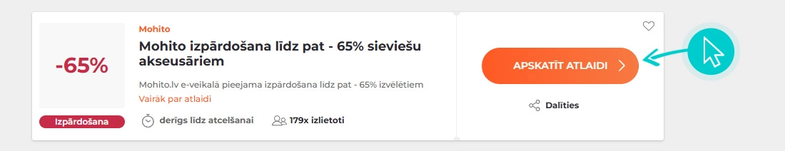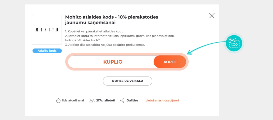 Apmeklē Kuplio.lv un izvēlies sev vēlamo Mohito atlaidi mūsu vietnē un klikšķini uz pogas “Apskatīt atlaidi”. Uzreiz pēc tam tu tiksi automātiski novirzīts uz oficiālo Mohito interneta veikalu, kur varēsi iegādāties preces par izdevīgāku cenu.