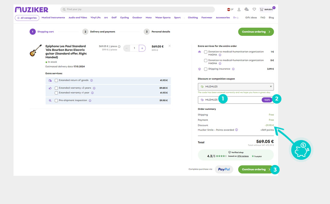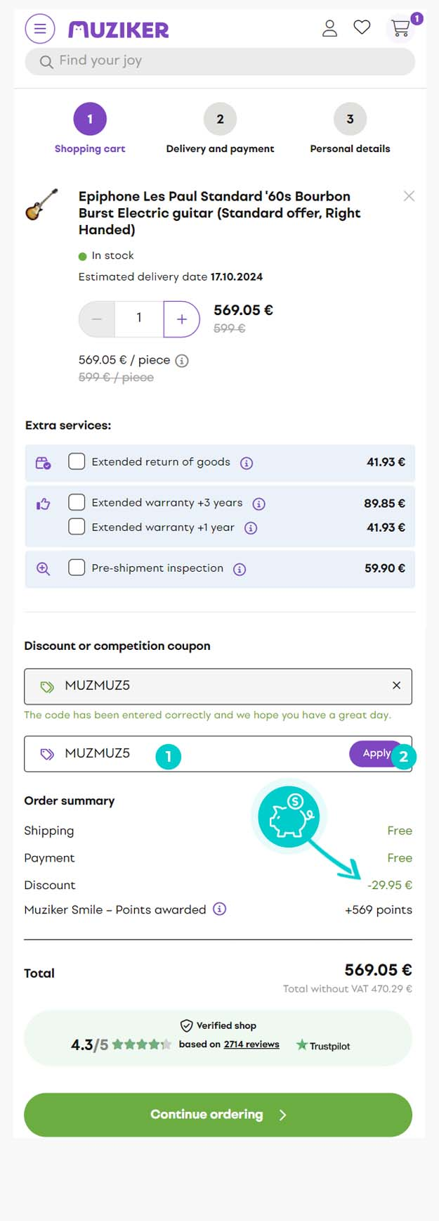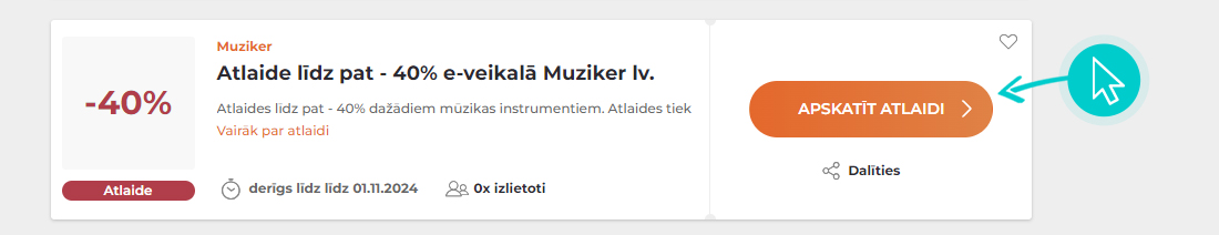 Muziker.lv e-veikalā, ievadot atlaižu kuponu iepirkumu grozā, saņem atlaidi līdz pat - 60%. Labākos atlaižu kuponus vari atrast Kuplio.lv. Atlaide neattiecas uz īpašā piedāvājuma precēm un tiek piešķirta saskaņā ar veikala norādītajiem nosacījumiem, kas var mainīties un ir plašāk pieejami veikala tīmekļa vietnē. Labākos atlaižu kuponus vari atrast Kuplio.lv.
