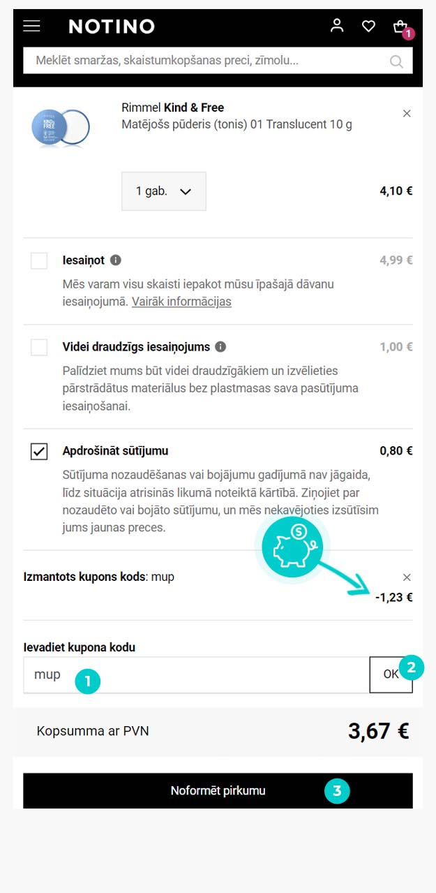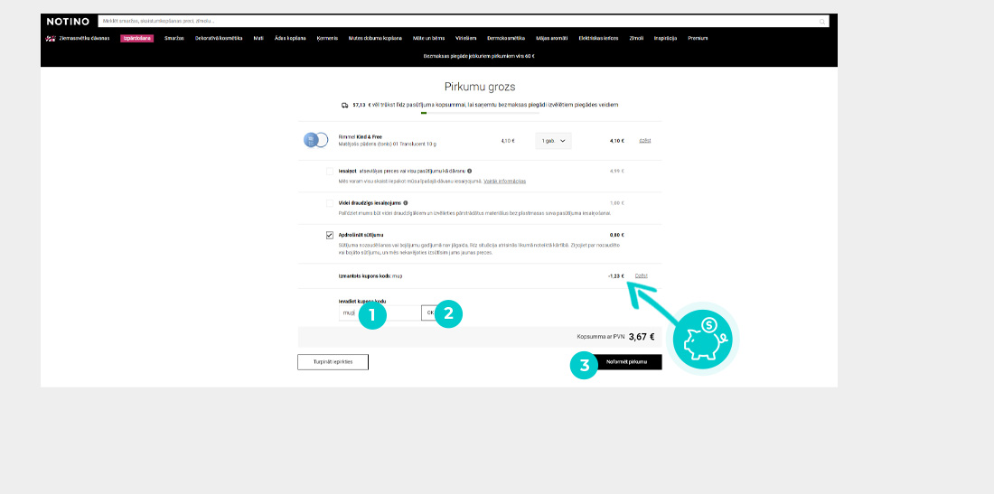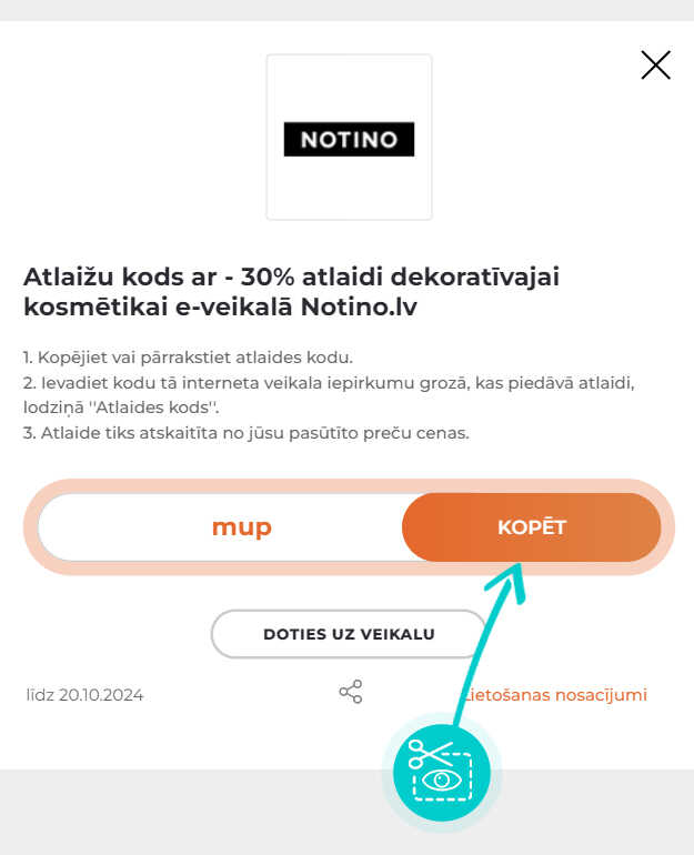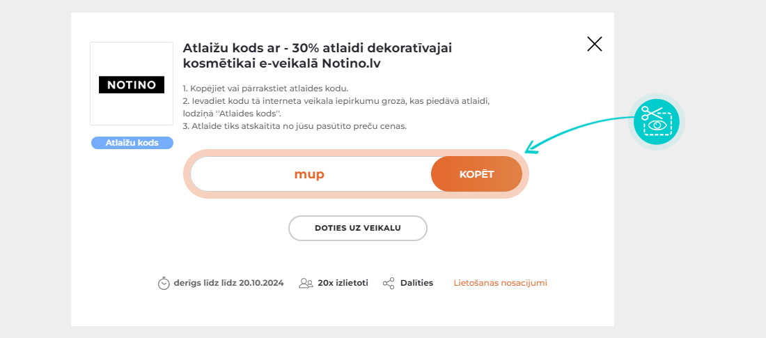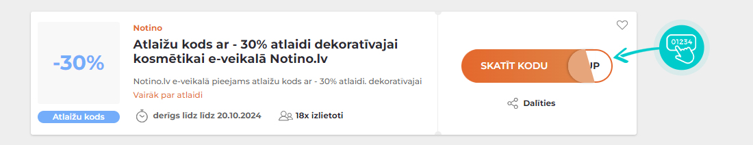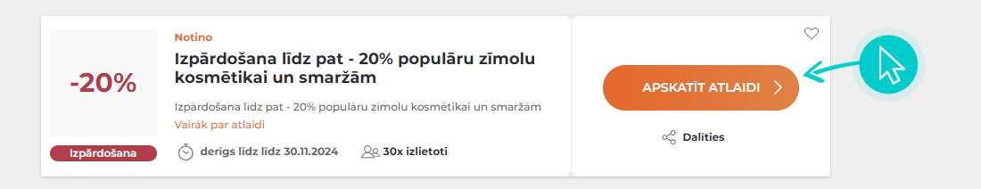 Notino e-veikalā, ievadot atlaižu kodu iepirkumu grozā, saņem atlaidi līdz - 20% izvēlētām smaržām. Notino atlaides kods neattiecas uz īpašā piedāvājuma precēm un tiek piešķirts saskaņā ar veikala norādītajiem nosacījumiem, kas var mainīties un ir plašāk pieejami veikala tīmekļa vietnē.