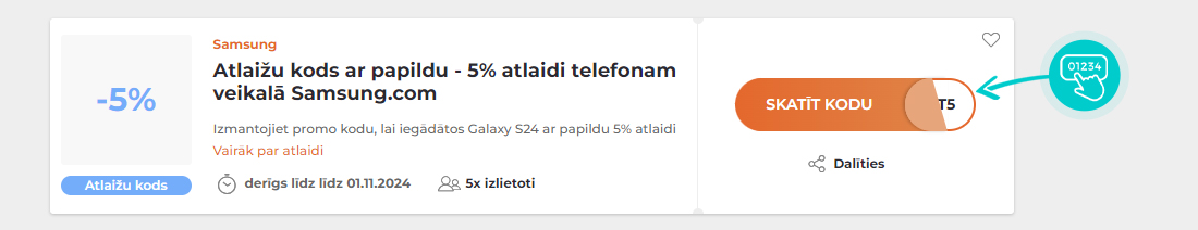 Atrodi sev vēlamo Samsung atlaides kodu mūsu vietnē un noklikšķini uz pogas "Skatīt kodu".