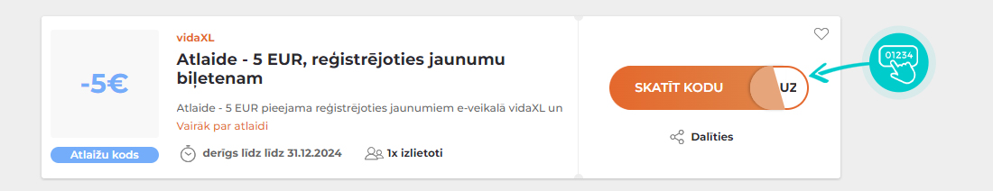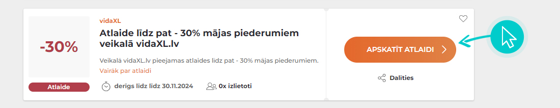 Apmeklē Kuplio.lv un izvēlies sev vēlamo vidaXL atlaidi mūsu vietnē un klikšķini uz pogas “Apskatīt atlaidi”. Uzreiz pēc tam tu tiksi automātiski novirzīts uz oficiālo vidaXL interneta veikalu, kur varēsi iegādāties preces par izdevīgāku cenu.