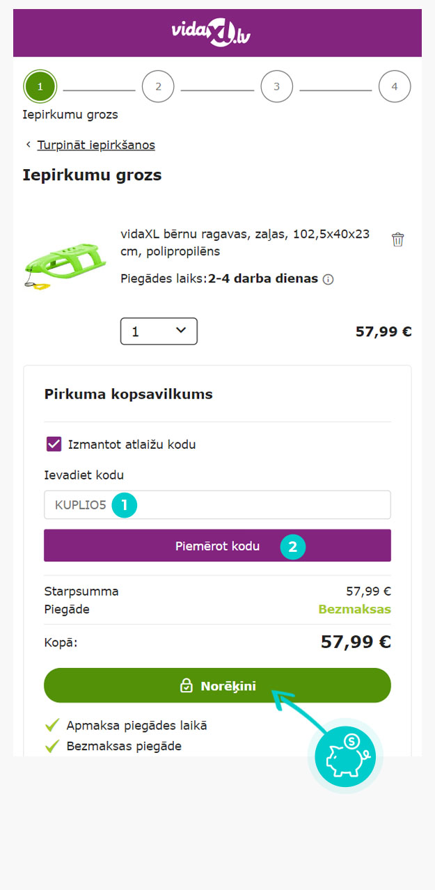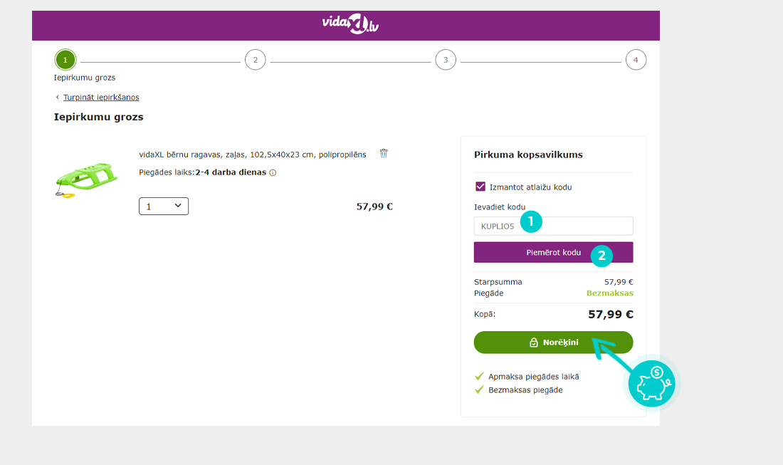 Kad esi gatavs veikt pirkumu, dodies uz iepirkumu grozu un zem preces atradīsi lauku “Ievadiet kodu”, kurā vari ierakstīt savu atlaides kodu. Lai piemērotu atlaidi, nospied pogu “Piemērot kodu”.